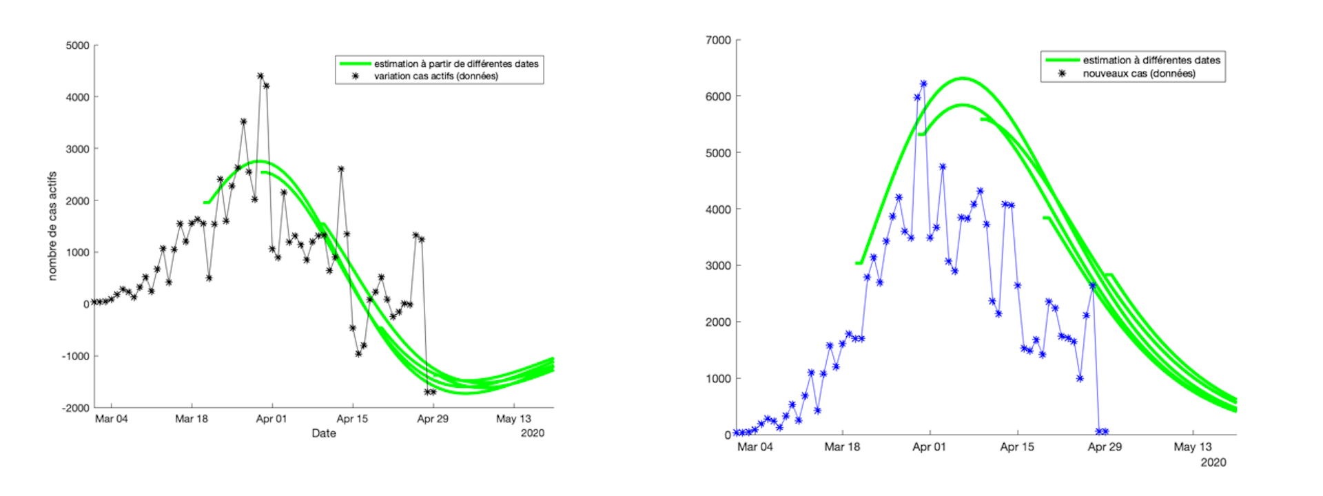 Figure 4 : évolution de la variation de cas actifs (g.) et du nombre de nouveaux cas (d.) à partir des données collectées jusqu’à différentes dates : 20 mars, 30 mars, 9, 19 et 29 avril (à noter qu’une erreur de remontée entre le 28 et le 29 avril fait apparaître un nombre de nouveaux cas non réaliste au 29 avril).